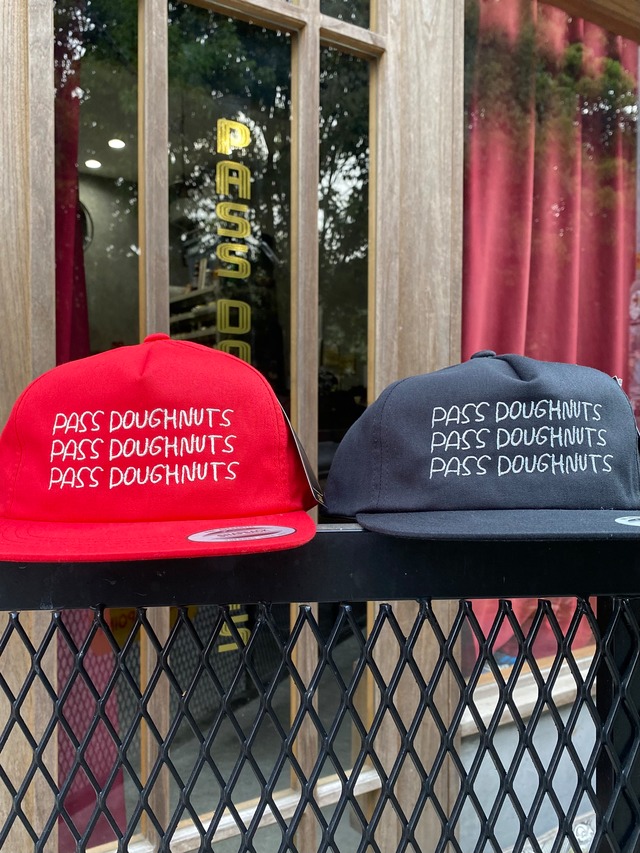 PASS DOUGHNUTS スナップバックキャップ 「DEEP CAP」 デザインはイラストレーターの小川洋平氏 赤ボディ×白刺繍 黒ボディ×グレー刺繍 スナップバックなのでサイズ調整可能 是非、目深に被って御来店を